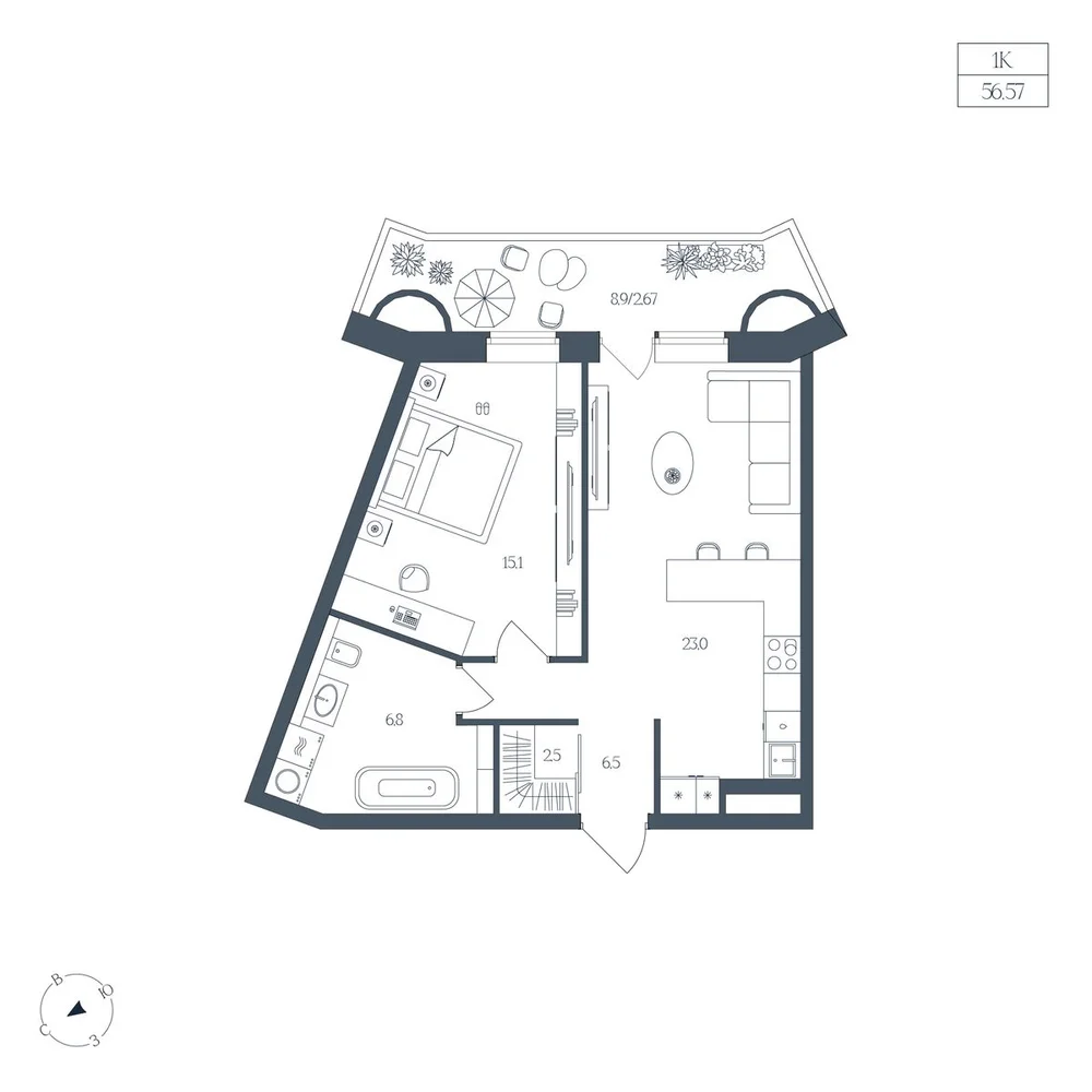 1-комнатная 56.57 м