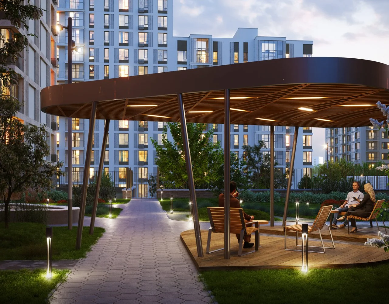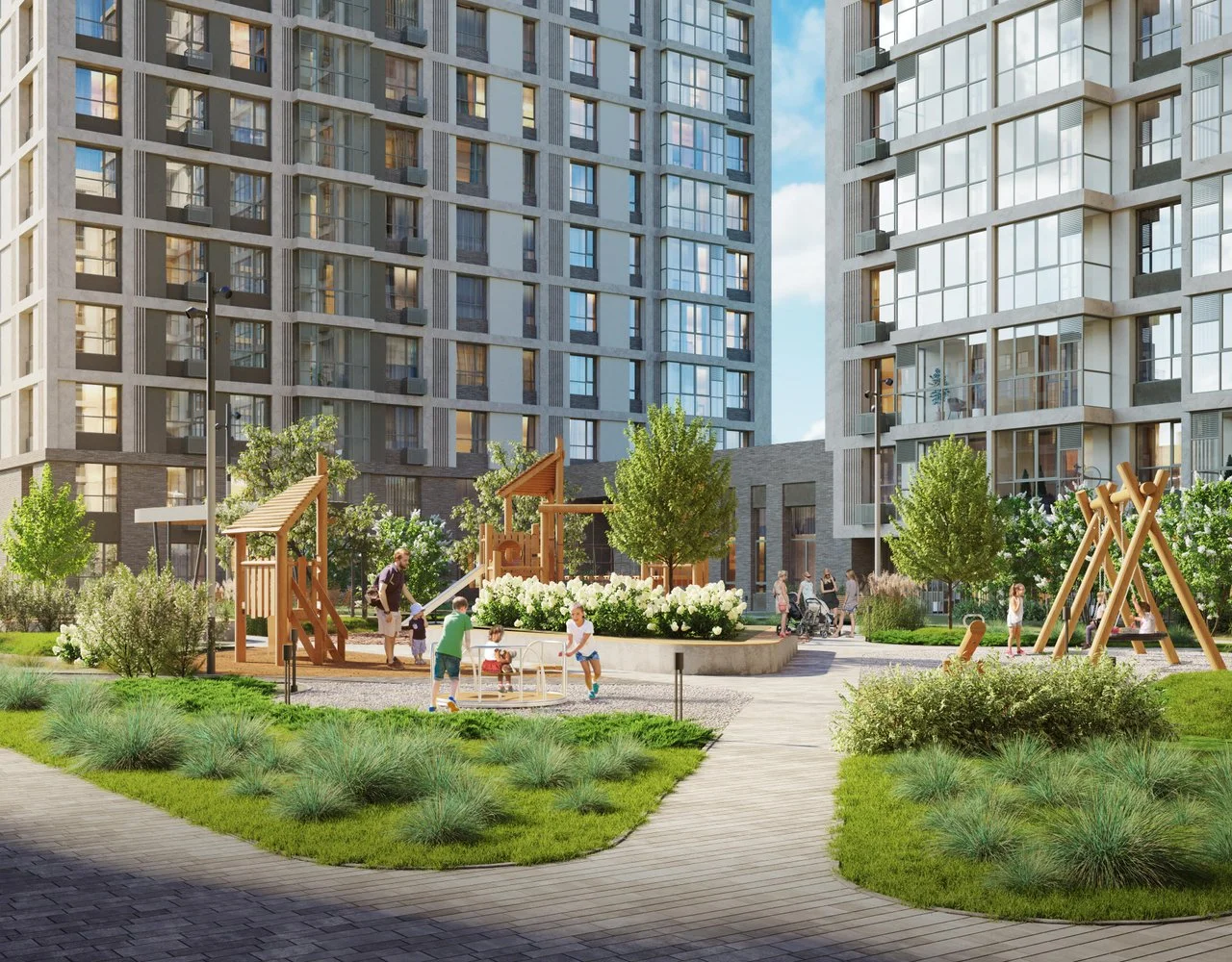 Дворы в «Клевере» — уютные, безопасные и грамотно зонированные продолжения вашего дома, где каждый найдёт занятие по душе. Современные детские площадки с атравматичным покрытием и разнообразными элементами развивают активность и фантазию детей всех возрастов. Ландшафт с обилием зелени и цветов создаёт уют. Беседки и зона для пикника — удобное место встреч. Используются экологичные материалы и современное оборудование от ведущих производителей.