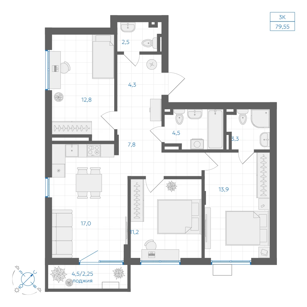 3-комнатная 77.65 м