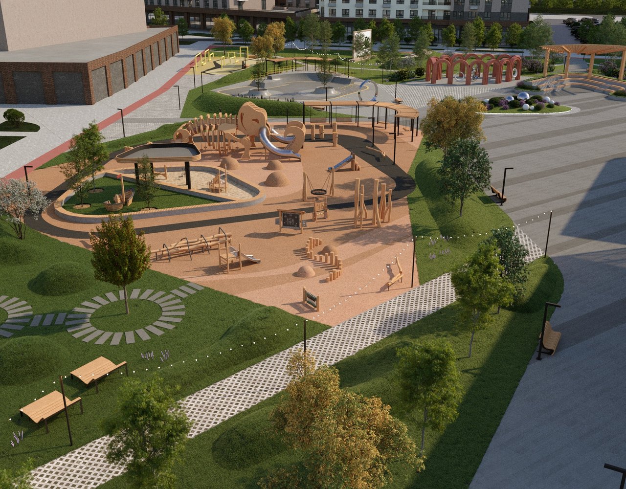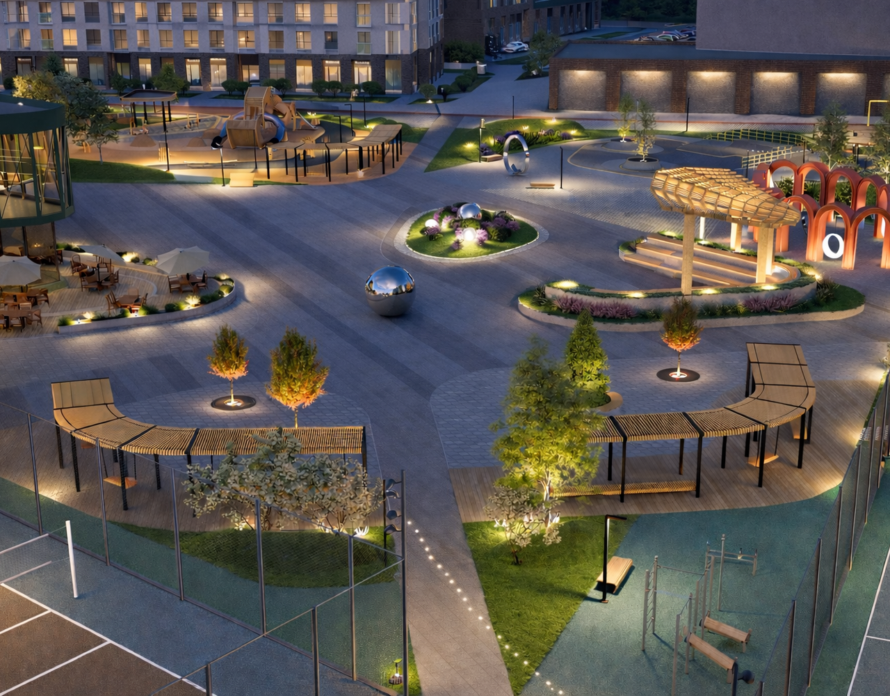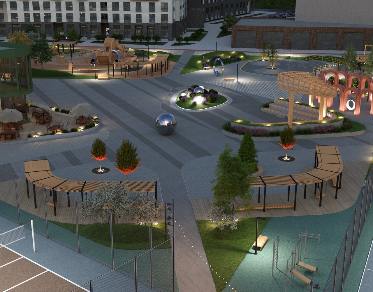 Главная площадь — это не просто архитектурный акцент, а настоящее сердце кварталов. Она соединяет всё вокруг — дома, дворы, дороги и аллеи, ритмы жителей. Здесь можно быть активным — играть в баскетбол, заниматься на воркаут площадках, бегать в поисках выхода по лабиринту. Можно быть неспешным — гулять по аллеям, пить чай на летней веранде, смотреть кино под открытым небом. Или просто быть вместе.