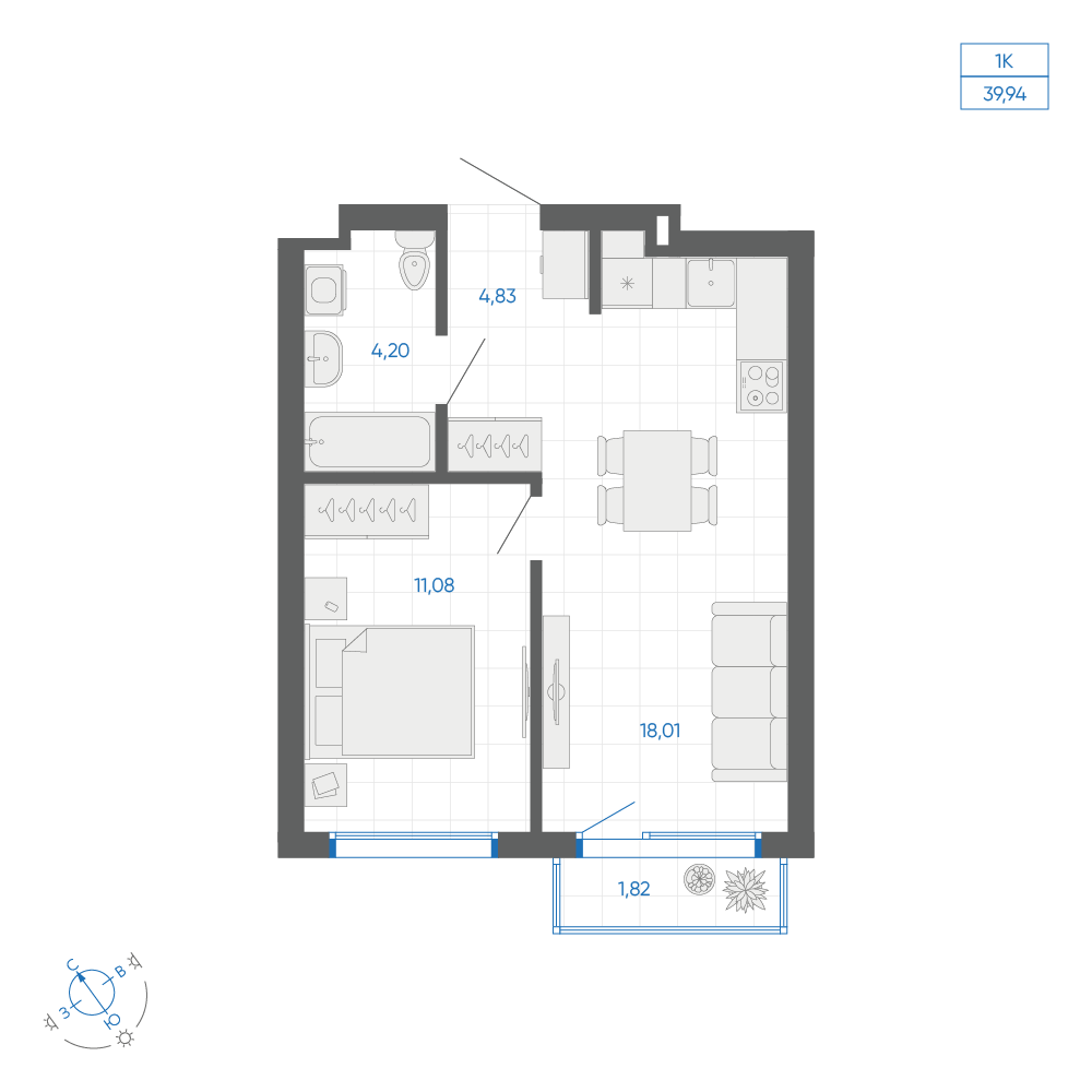1-комнатная 43.3 м