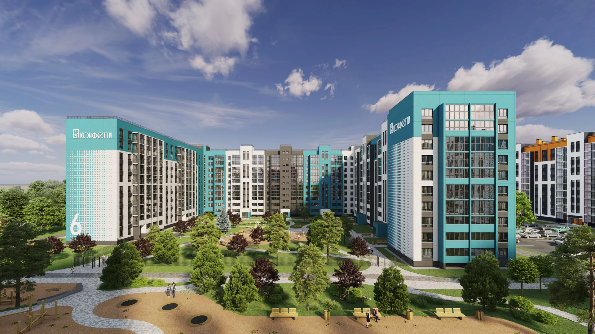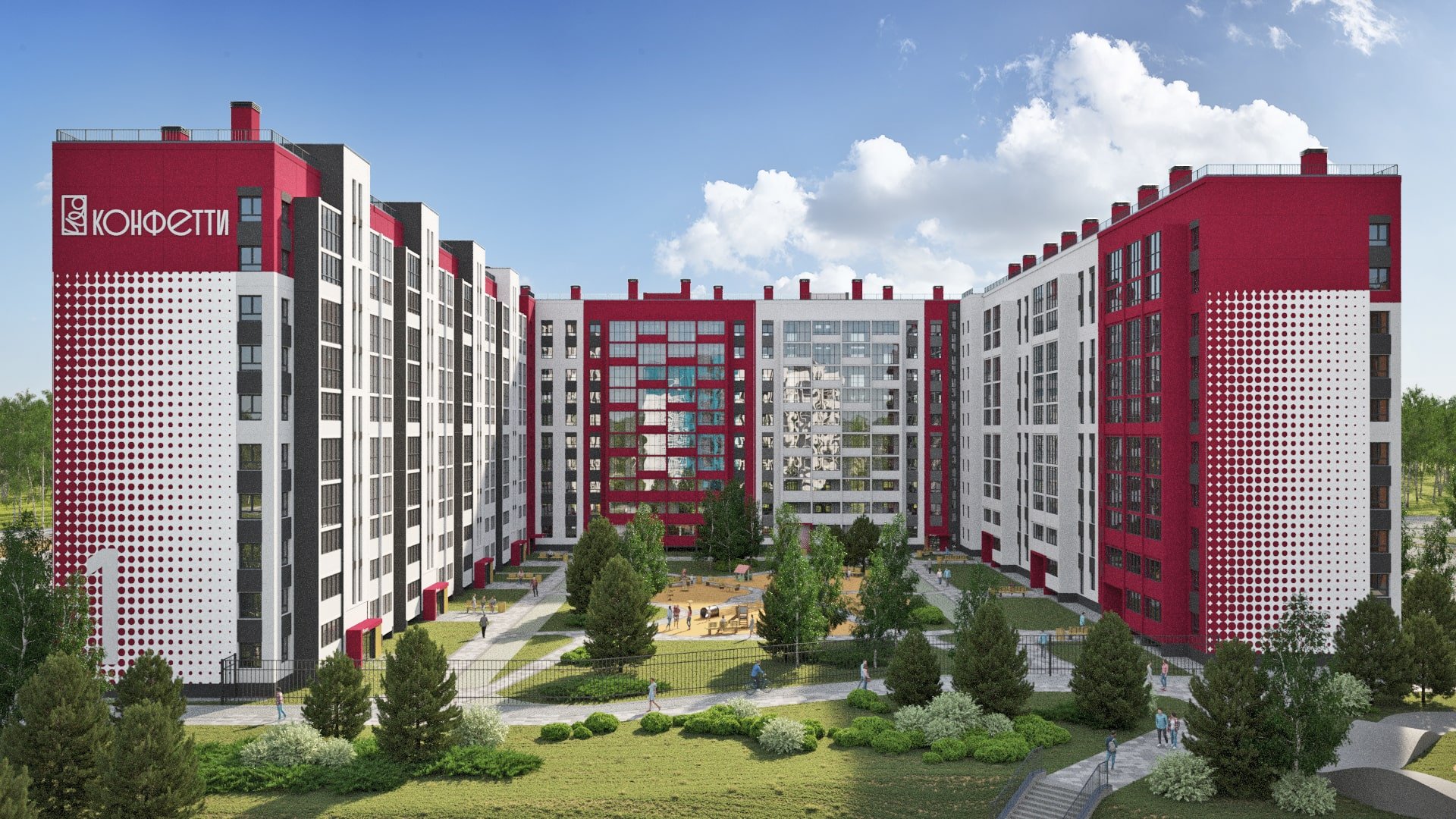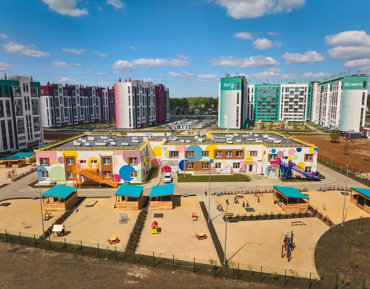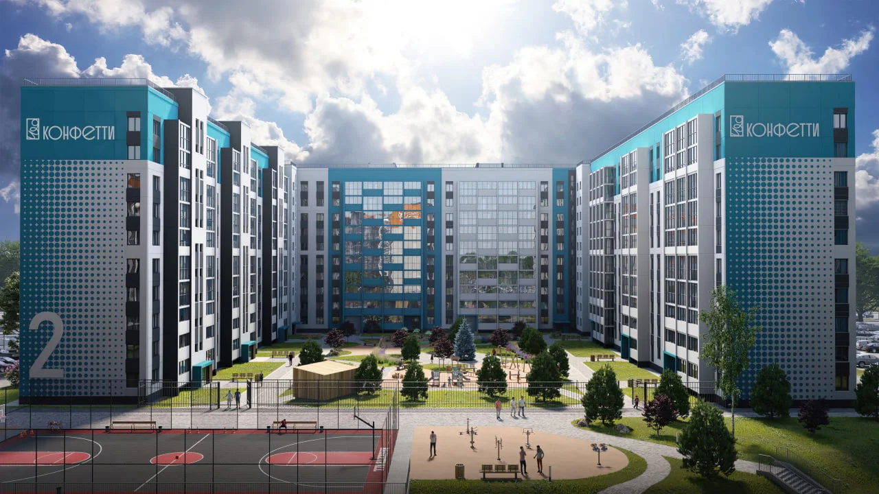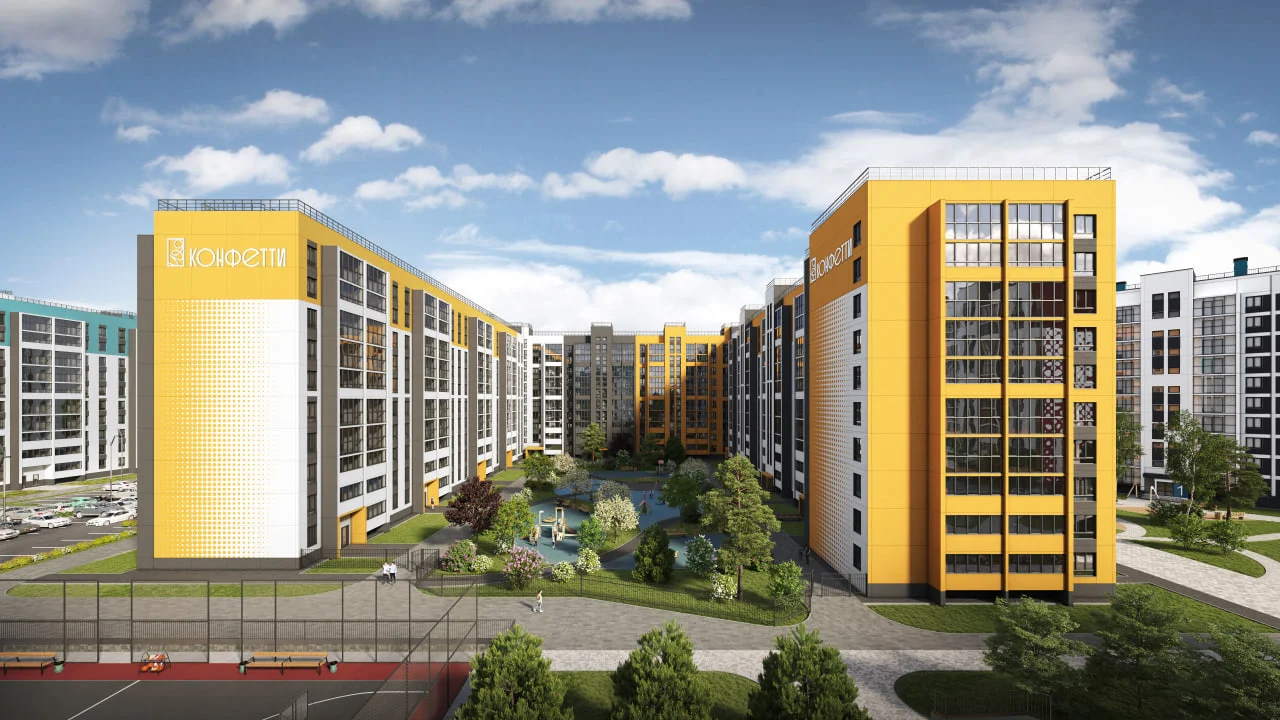 Проект включает детский сад на территории комплекса и собственную прогулочную аллею как зону притяжения для жителей города. На детских площадках юные жители комплекса «Конфетти» смогут играть круглый год. Как и во всех проектах ГК "ИКАР", территория каждого двора будет огорожена. Чтобы сделать жилой комплекс уютнее предусмотрено ландшафтное озеленение.
