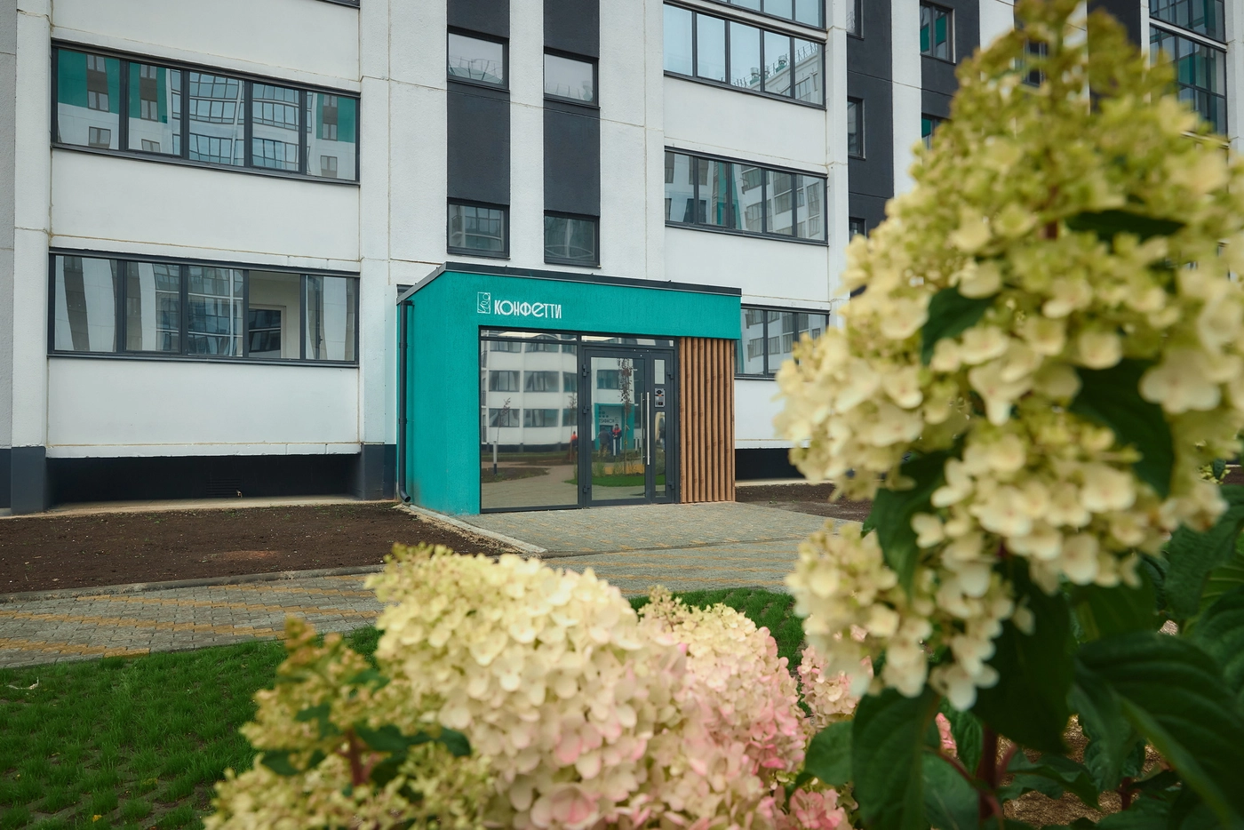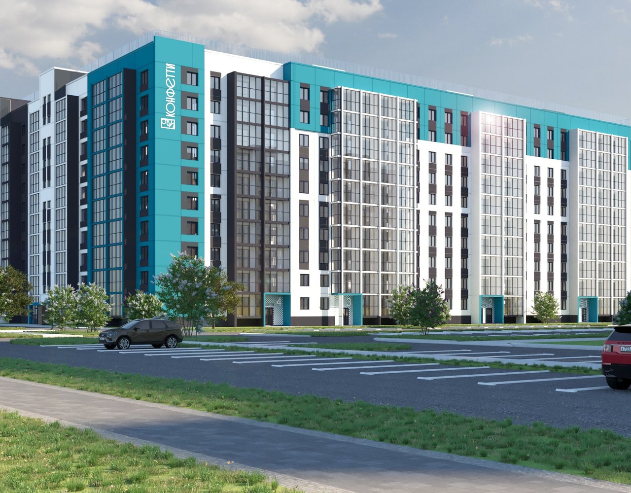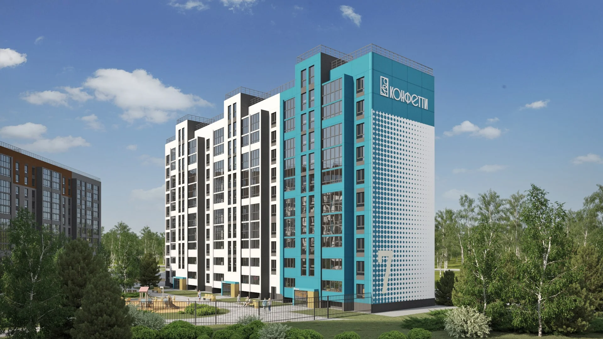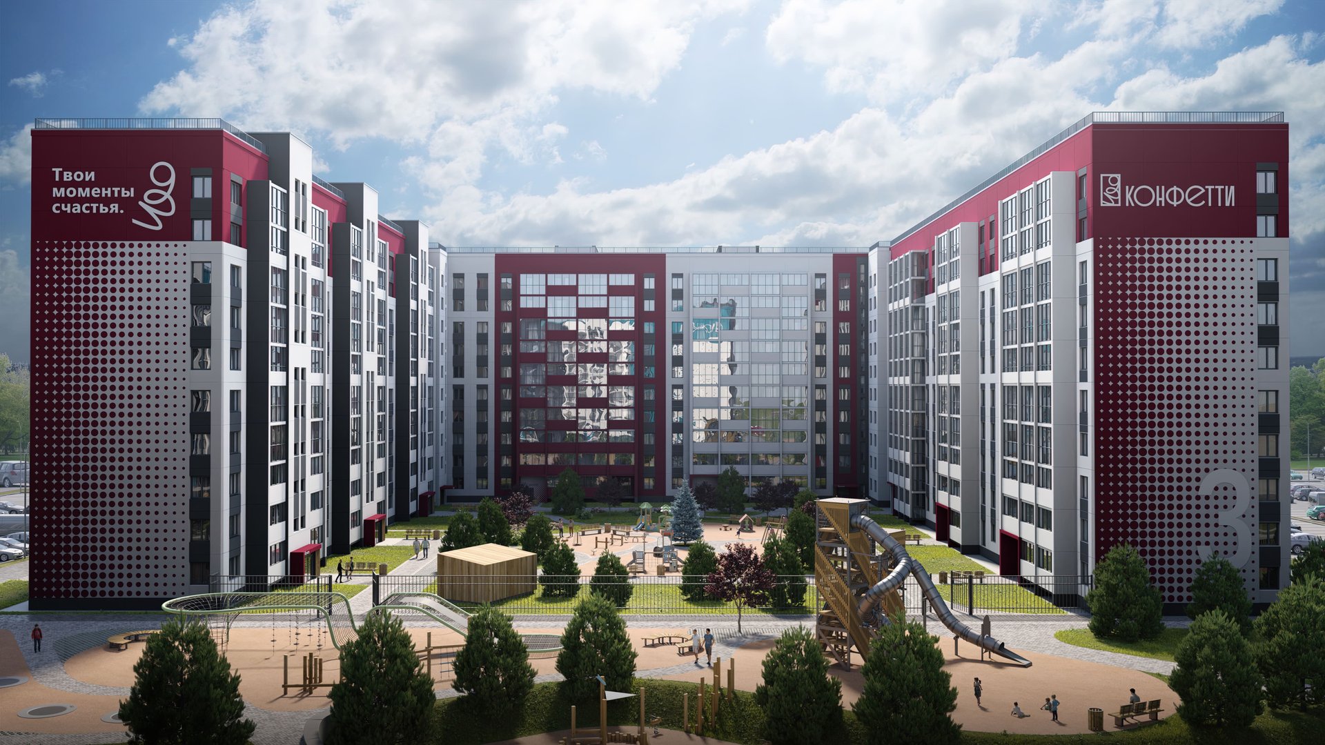Проект включает детский сад на территории комплекса и собственную прогулочную аллею как зону притяжения для жителей города. На детских площадках юные жители комплекса «Конфетти» смогут играть круглый год. Как и во всех проектах ГК "ИКАР", территория каждого двора будет огорожена. Чтобы сделать жилой комплекс уютнее предусмотрено ландшафтное озеленение.